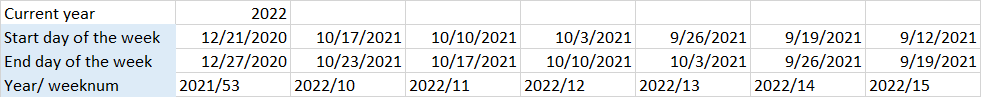 引用了年份/周,但是它返回了10/17/2021。它应该返回2/28/2022,并且随着周数的增加。返回日期减少。2021/53的日期是正确的,但其他日期错了。