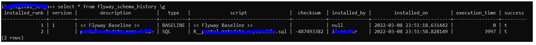 在此之后,flyway_schema_history向我们展示了以下结果: