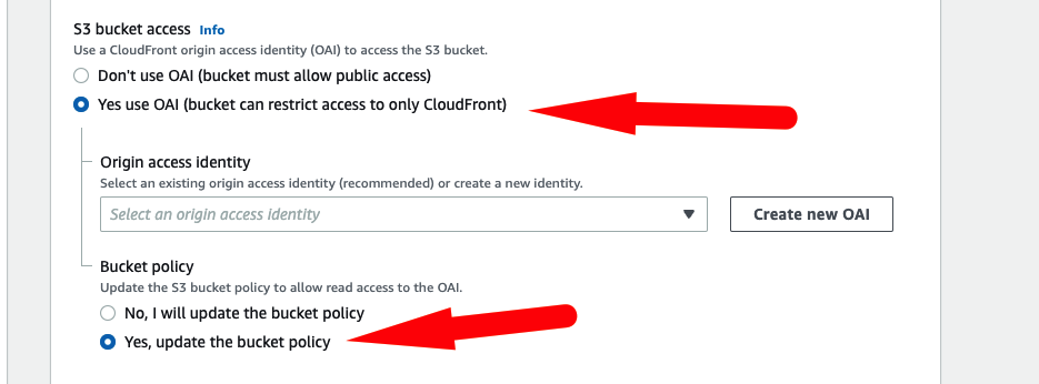 拒绝cloudfront的PUT访问,它将无法将数据放入s3。在s3权限中,只允许从cloudfront进行只读调用。关闭s3上的公共访问,以确保它只允许从cloudfront获取。在CloudFront上,在禁用对s3的任何公共访问之前,使用它来更新s3桶访问。CF将更新S3的策略并创建CF源访问标识: