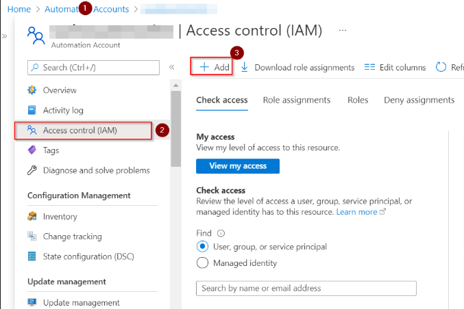 转到Azure Portal ->自动化帐户-> Access Control (IAM) ->添加角色
