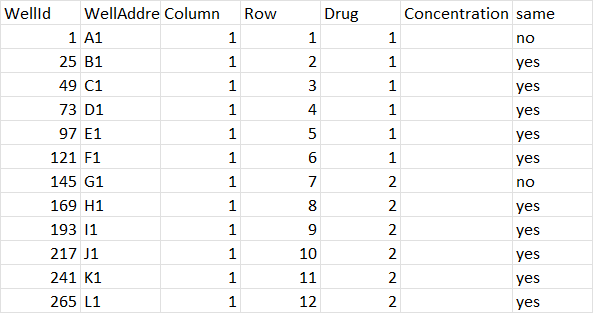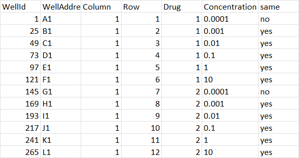 concentrations <- c(0.0001, 0.001, 0.01, 0.1, 1, 10)我想要发生的是,如果相同=“否”,向下填写浓度范围,如下所示: