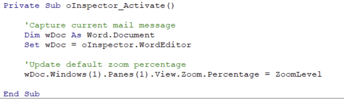 我在Outlook中找到了一个使用VBA (它随Outlook而来)的选项来永久增加预览窗格缩放设置。如果您不熟悉像我这样的应用程序的VBA,则需要30-45分钟才能实现。