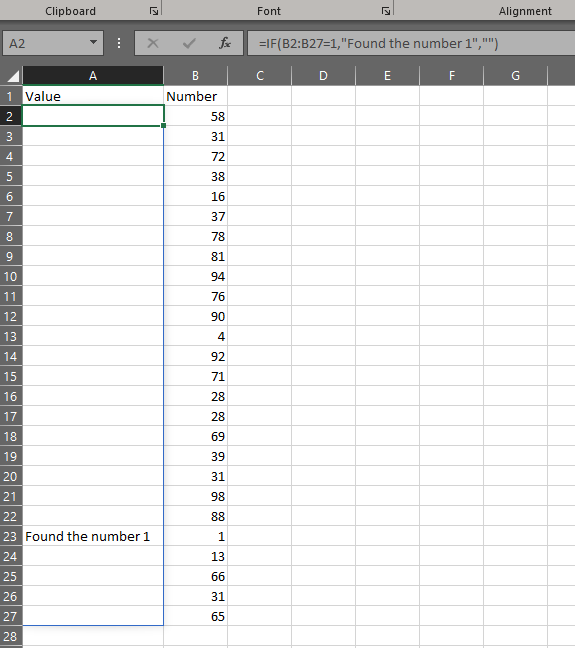Range函数=IF(B2:B27=1,“查找数字1","")