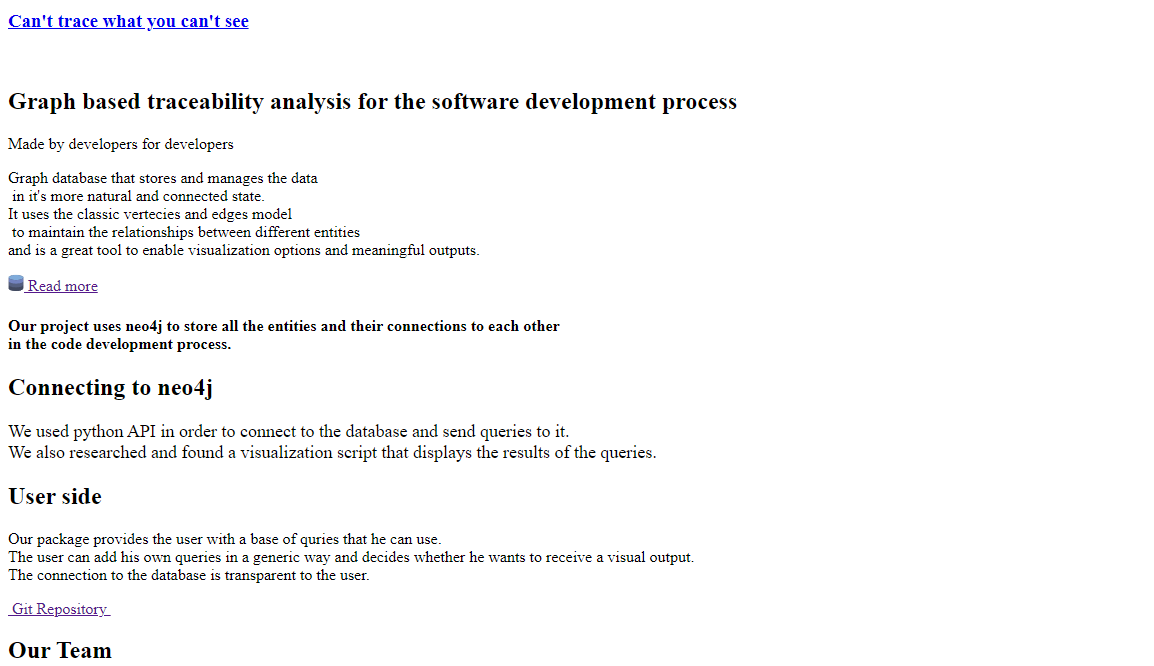 <meta name="keywords" content="Graph based traceability analysis for the software development process, Connecting to neo4j, User side, Our Team">