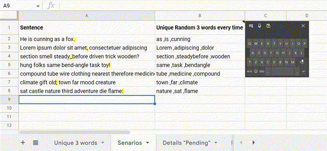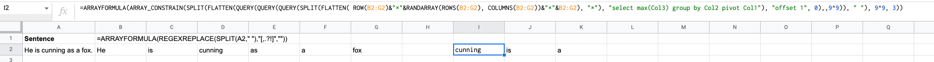RANDARRAY将[columns]设置为1,将行设置为COUNTA(UNIQUE(SPLIT(TRIM(REGEXREPLACE(A2,"[[:punct:]]",""))," "))),即COUNTA( He|is|cunning|as|a|fox )