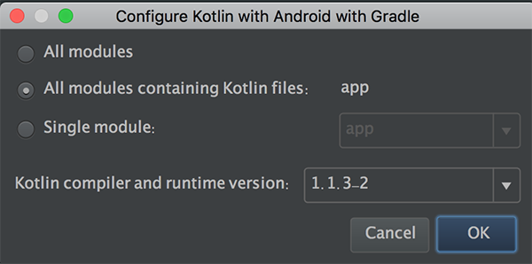 但是,当我试图将一个测试文件从Java转换到Kotlin时,我会得到一个对话框:"Kotlin在项目中没有配置,您必须在项目中配置Kotlin,然后再执行转换。“