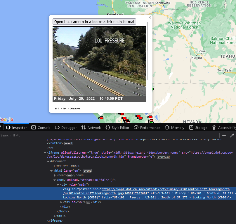 我希望在一个包含各种交通摄像头位置的交互式地图上刮取图像的源URL,并将它们作为列表导出到JSON或CSV。因为我试图从不同的网站收集这些数据,所以我尝试使用parsehub和octoparse,但没有效果。我以前尝试使用BS4和selenium,但是无法使用src提取div / img标记。任何帮助都将不胜感激。下面是两个不同网站的例子,它们有着相似但不同的方法来保存图像。