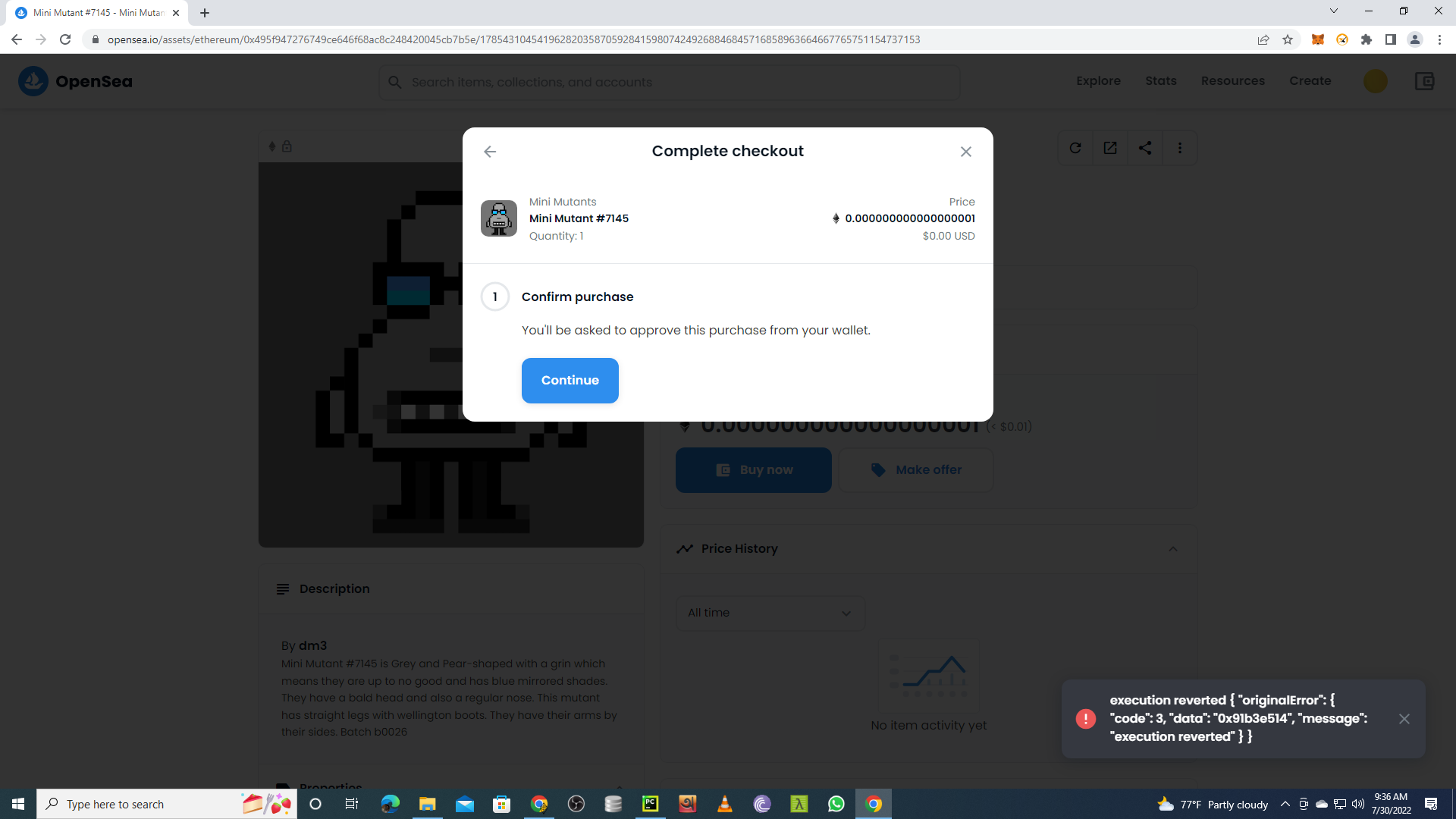 我想从Opensea买一辆nft。单击“继续”按钮时。