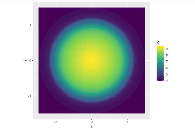 plot_df$z <- df$z[findInterval(plot_df$radius, df$x)]现在,我们可以使用geom_raster绘制结果。