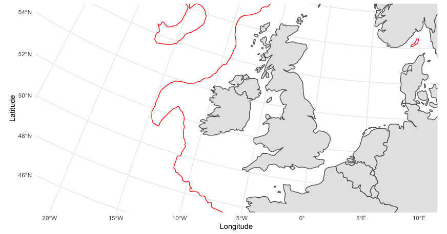我正在绘制一张东北大西洋的地图,上面突出了特定的等深线。考虑到这个区域,我更愿意使用LAEA投影。然而,这似乎会导致geom_contour失败。