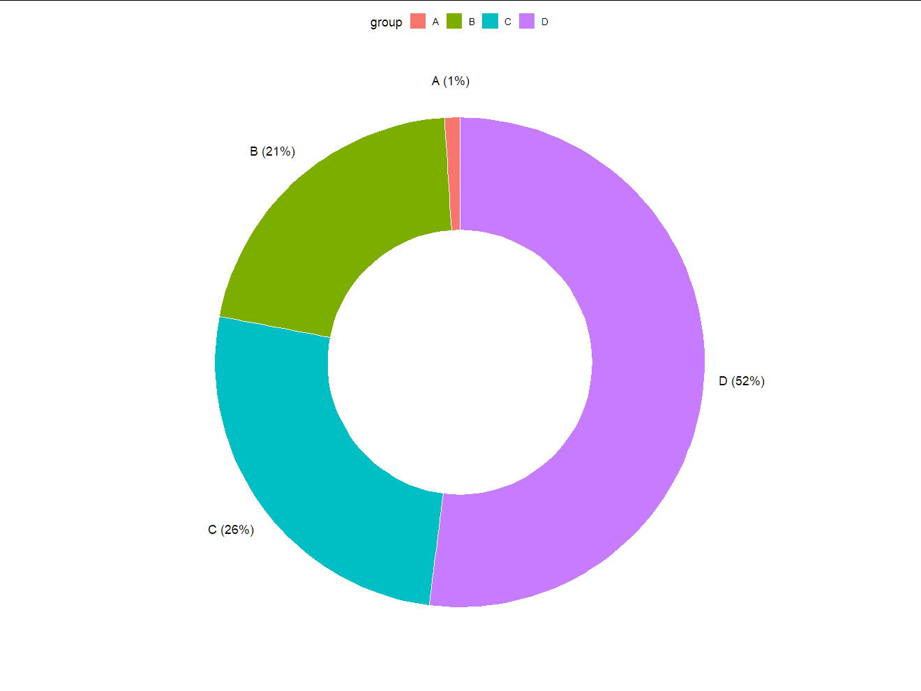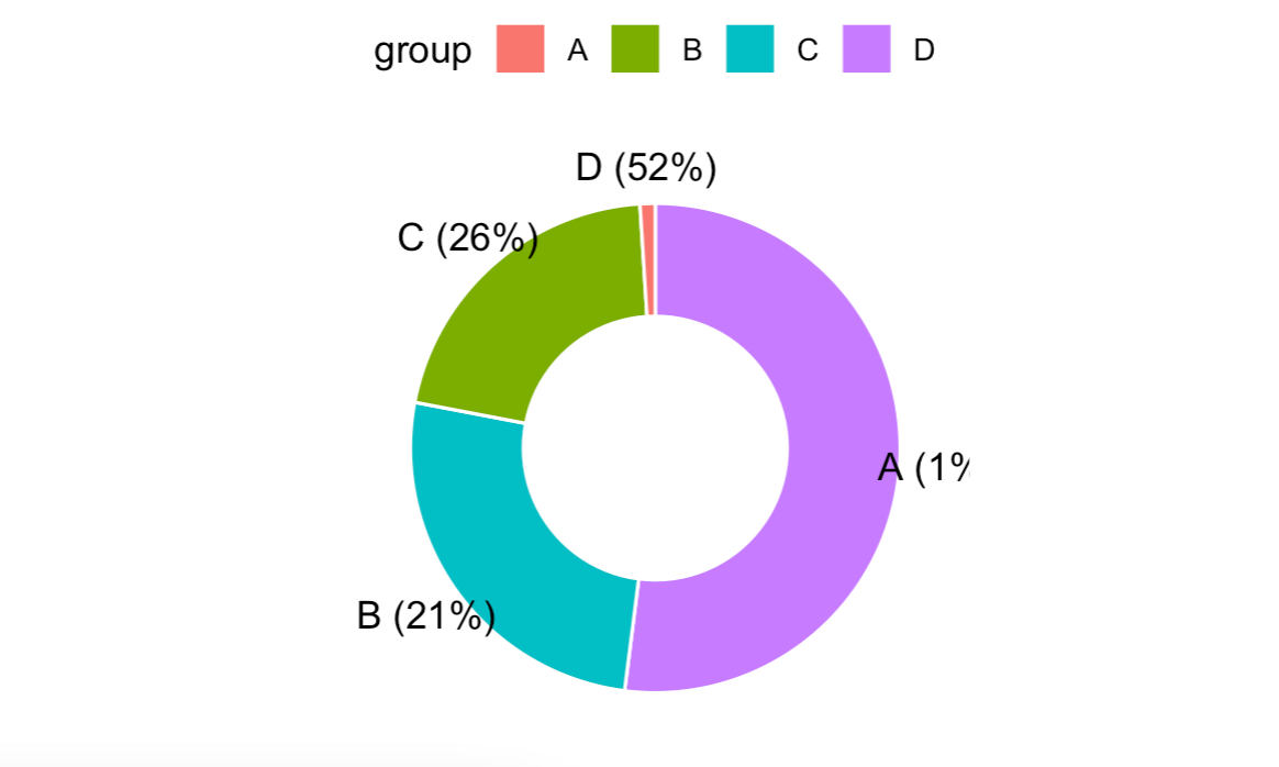 我稍微修改了ggpubr包中的甜甜圈图示例,当我添加标签时,它将标签移动到错误的组。在下面的例子中,'A‘是最小的组,但是它得到了标签'D’。我记得,这种情况也发生在ggplot中。我也会增加一个例子。有人知道怎么解决这个问题吗?