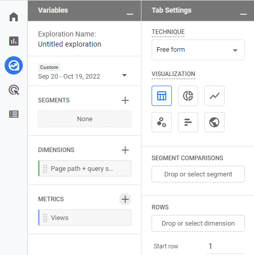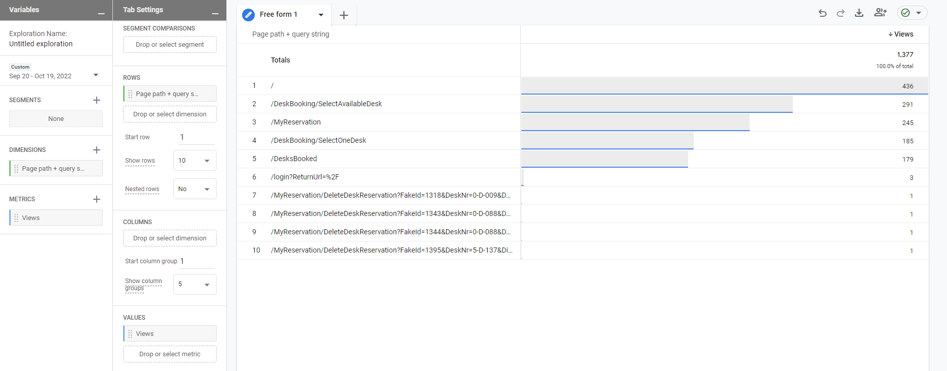 完成之后,您需要在行下和值下拖放或选择该维度。因此,对于行选择页路径和查询字符串,对于值选择视图。就像这样: