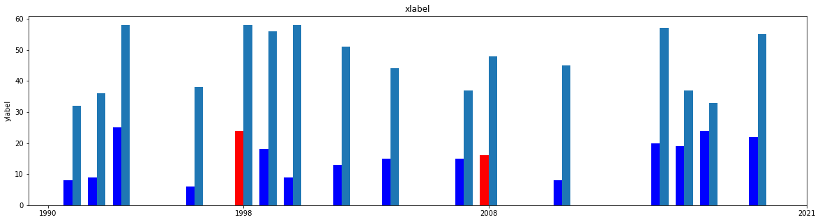 这就是你要找的吗?我更新了代码,以便它检查x(年份)是否在列表中,并将x条画成蓝色/红色。由于x,y,z数据不可用,使用了随机数据(前3行)。