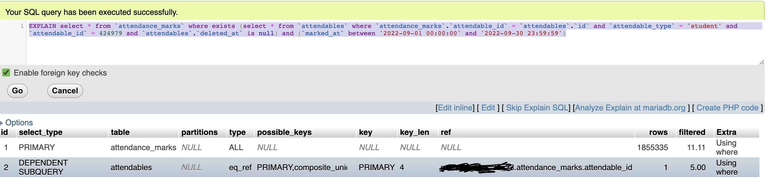 and (`marked_at` between '2022-09-01 00:00:00' and '2022-09-30 23:59:59')这个查询花费的时间太长,大约7-10秒。我正试图优化它,但我仍然停留在这里。