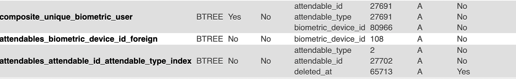 b: INDEX(attendable_type, attendable_id, attendables)注意,日期时间范围适用于任何粒度。