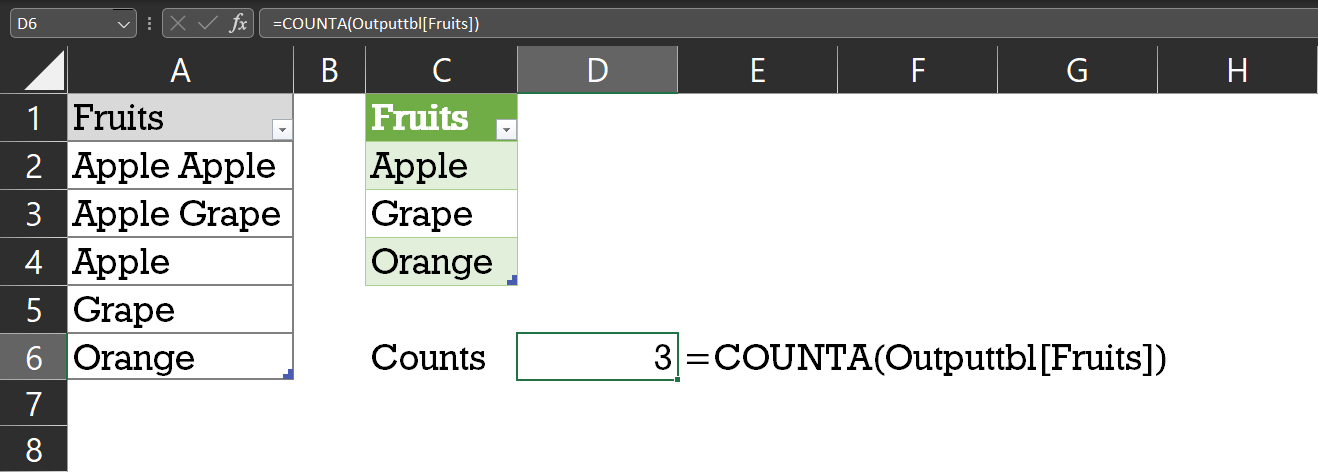 =COUNTA(Outputtbl[Fruits])发布于 2022-10-03 02:05:01