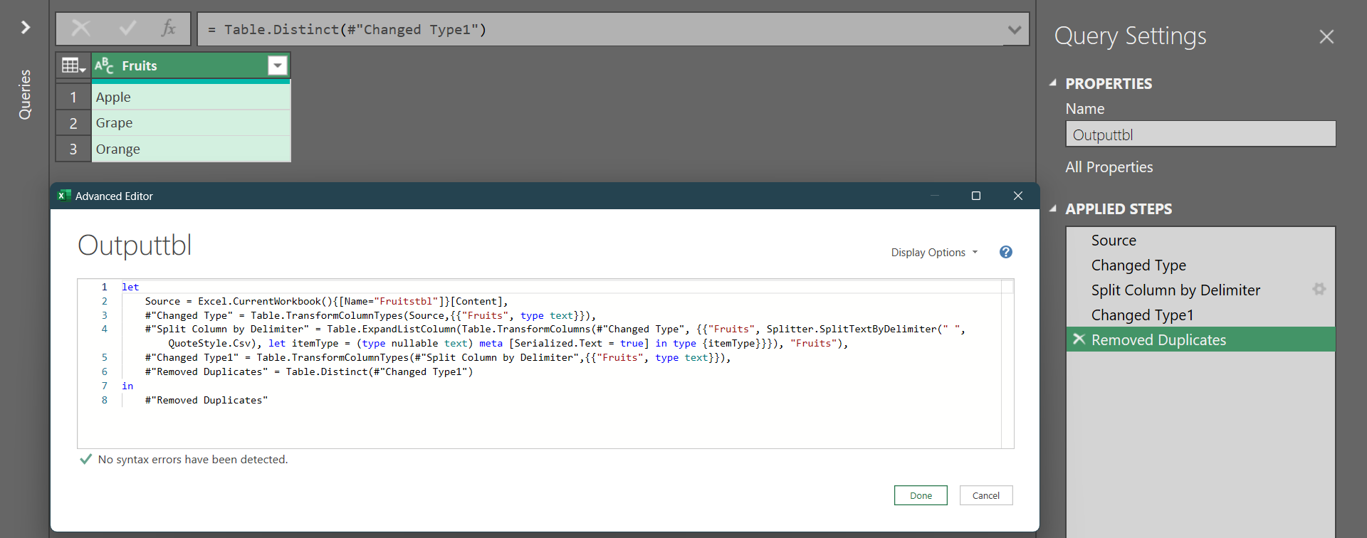 #"Split Column by Delimiter" = Table.ExpandListColumn(Table.TransformColumns(#"Changed Type", {{"Fruits", Splitter.SplitTextByDelimiter(" ", QuoteStyle.Csv), let itemType = (type nullable text) meta [Serialized.Text = true] in type {itemType}}}), "Fruits"),