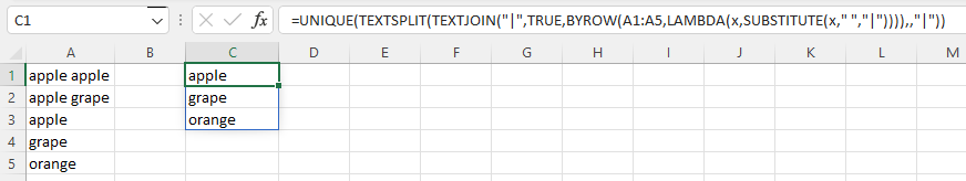 =UNIQUE(TEXTSPLIT(TEXTJOIN("|",TRUE,BYROW(A1:A5,LAMBDA(x,SUBSTITUTE(x," ","|")))),,"|"))为了得到唯一的单词数,试着-