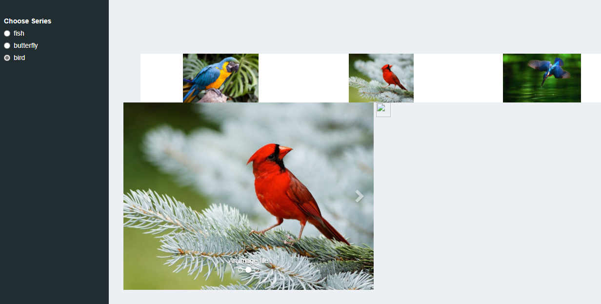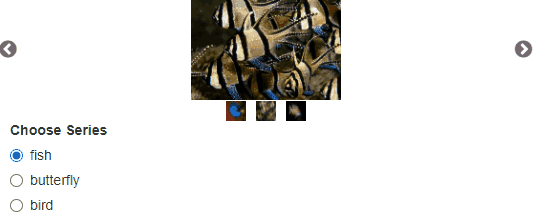 我正在努力解决的主要问题是,我想要将点转换成图像,并让它们在选择每个系列时动态更新。这里的目标是,我希望在上面显示一个更大的图像,并在下面显示一系列的“缩略图”,这样用户就可以知道每一张照片的样子,而不必浏览旋转木马中的每一张图片。