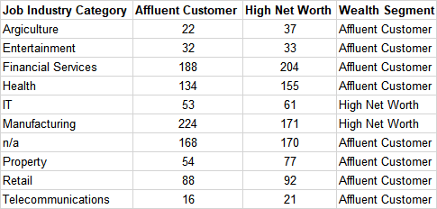 { FIXED [Job Industry Category], [Wealth Segment] : COUNT([Wealth Segment]) } = MAX(