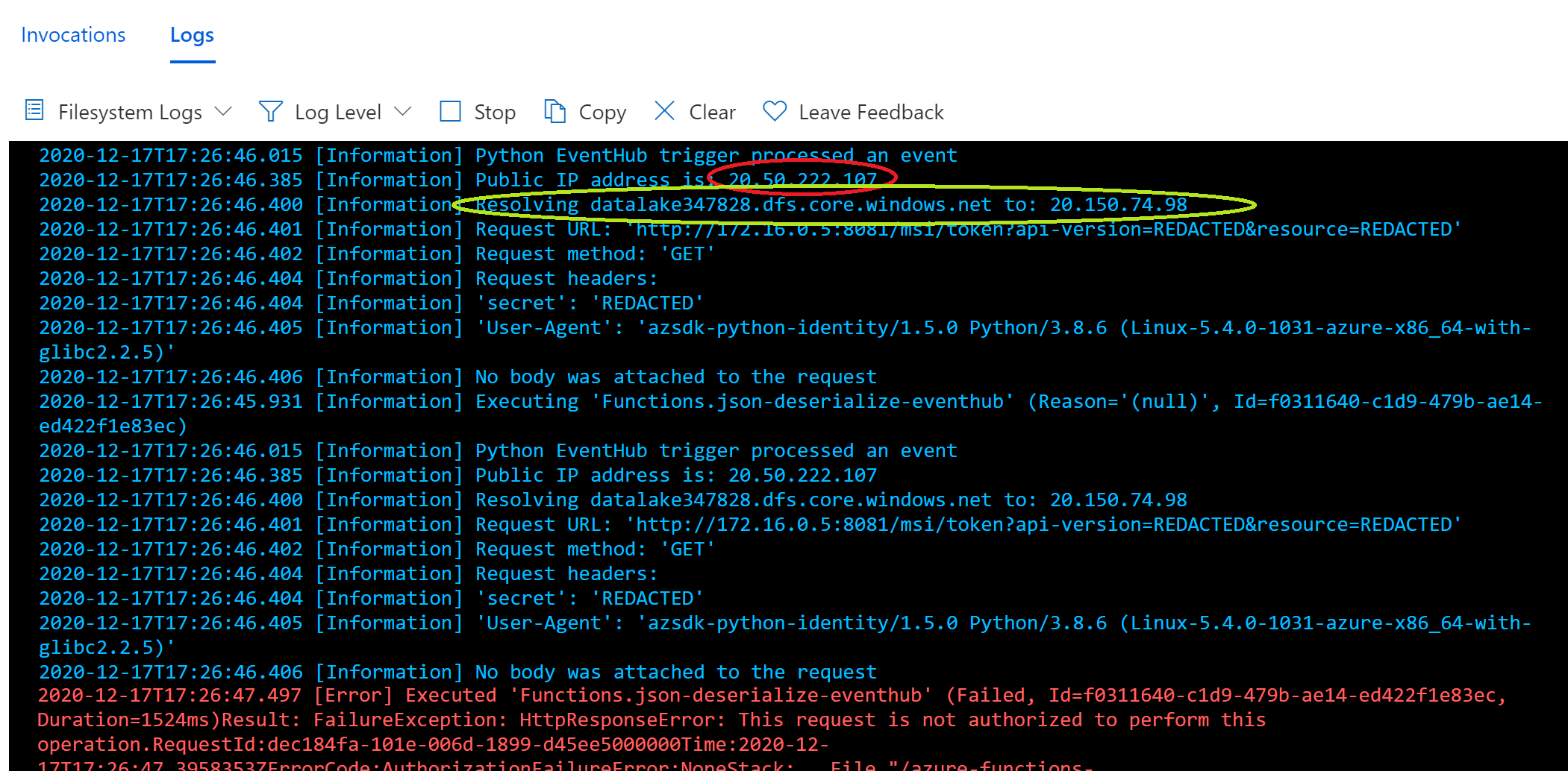 执行的‘Functions.json-deserialize’( File,Id=10554e46-2f5e-42a7-a9f7-a95dad1b4e30,Duration=1063ms)结果: FailureException: HttpResponseError:此请求未被授权执行此文件"/azure-functions-host/workers/python/3.8/LINUX/X64/azure_functions_worker/dispatcher.py",行355,在"/usr/local/lib/python3.8/concurrent/futures/thread.py",=self._loop.run_in_executor(文件_handle__invocation_requestcall_result第57行)中,在_handle__invocation_requestcall_result= self.fn(*self.args,**self.kwargs)文件第542行中,在文件"/home/site/wwwroot/json-deserialize-eventhub/init.py",(**params)第38行中,在maindlc.append_object(obj_converted,data_lake_target_url)文件"/home/site/wwwroot/shared/datalake.py“中,第41行,在file_system_containers:File "/home/site/wwwroot/.python_packages/lib/site-packages/azure/core/paging.py",第129行的append_objectfor容器中,在"/home/site/wwwroot/.python_packages/lib/site-packages/azure/core/paging.py",的__next__return next(self._page_iterator)文件第76行,在__next__self._response =self._get_next(self.continuation_token)文件的第401行,在"/home/site/wwwroot/.python_packages/lib/site-packages/azure/storage/blob/_shared/response_handlers.py",文件_get_next_cbprocess_storage_error(错误)第147行中,在process_storage_errorraise错误中