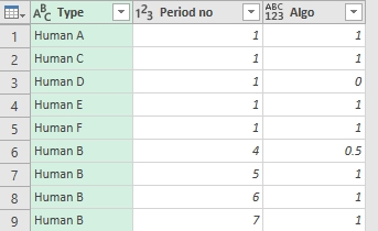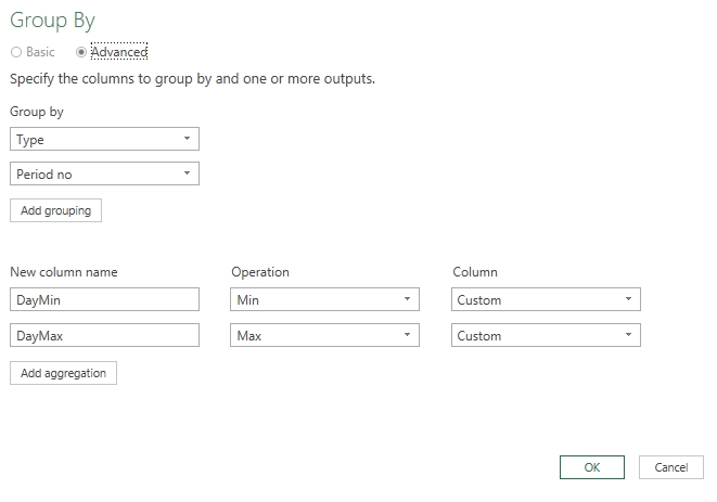 #"Grouped Rows" = Table.Group(#"Expanded Table1", {"Type", "Period no"}, {{"DayMin", each List.Min([Custom]), type number}, {"DayMax", each List.Max([Custom]), type number}}),