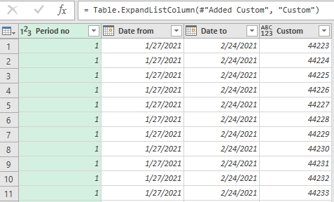 #"Expanded Table1" = Table.ExpandTableColumn(#"Merged Queries", "Table1", {"Period no"}, {"Period no"}),