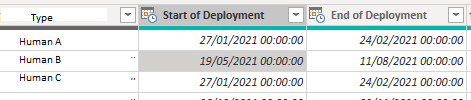 #"Changed Type" = Table.TransformColumnTypes(Source,{{"Type", type text}, {"Start of Deployment", type date}, {"End of Deployment", type date}}),