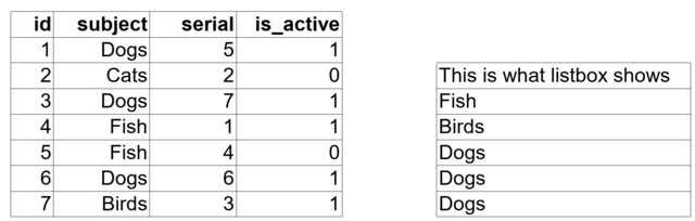 我希望GUI首先向所有is_active=1展示列表框中的主题。然后单击"Dogs“(列表框显示的第三项),然后单击按钮,让程序打印整行(id=1、subject=Dogs、serial=5、is_active=1)。