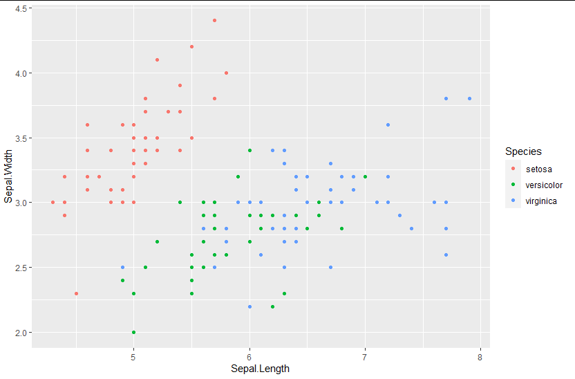 ggplot(data=iris, mapping = aes(Sepal.Length, Sepal.Width, color = Species)) +
