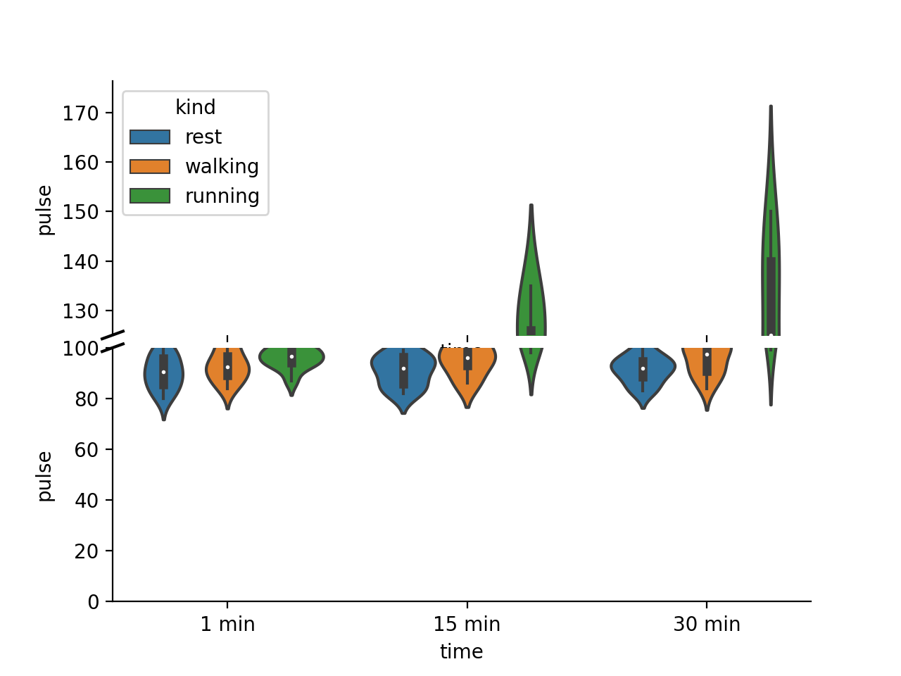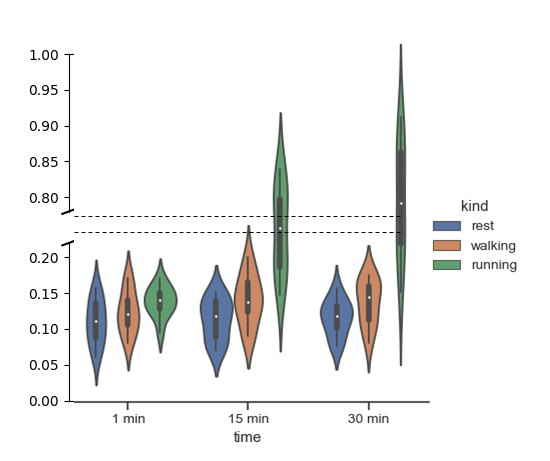 我寻找用y轴断裂的海运来绘制小提琴情节的连环画(因为我有一个因果过程,作用在两个不同的尺度上:一个在0,0.2到2,12之间,我的定量y-变量)。