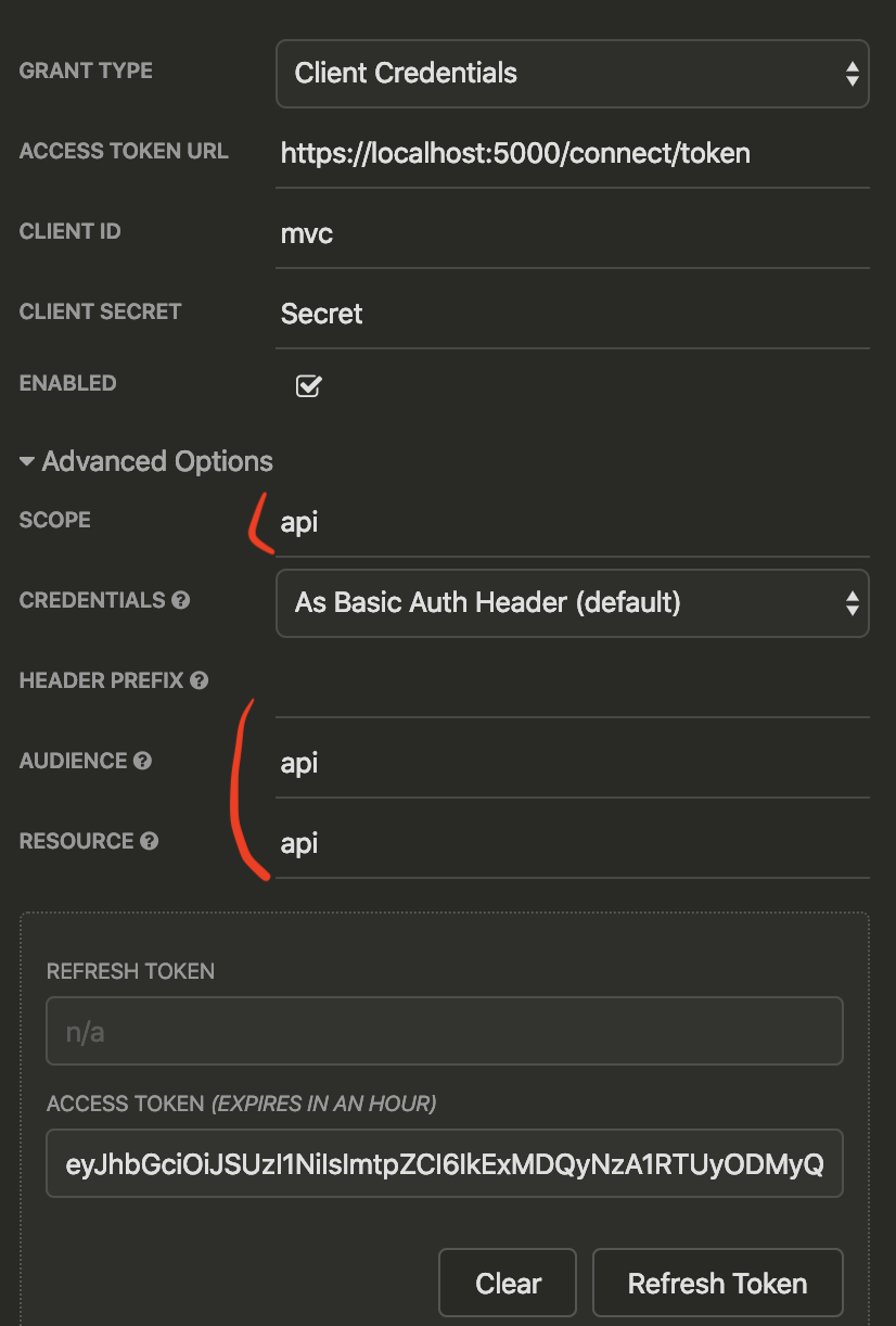 当使用只有作用域的模型时,不会将aud (受众)声明添加到令牌中,因为这个概念不适用。如果您需要一个aud声明,您可以在选项上启用EmitStaticAudience设置。这将以发行者名称/资源格式发出一个aud声明。如果您需要对aud索赔进行更多控制,请使用API资源。