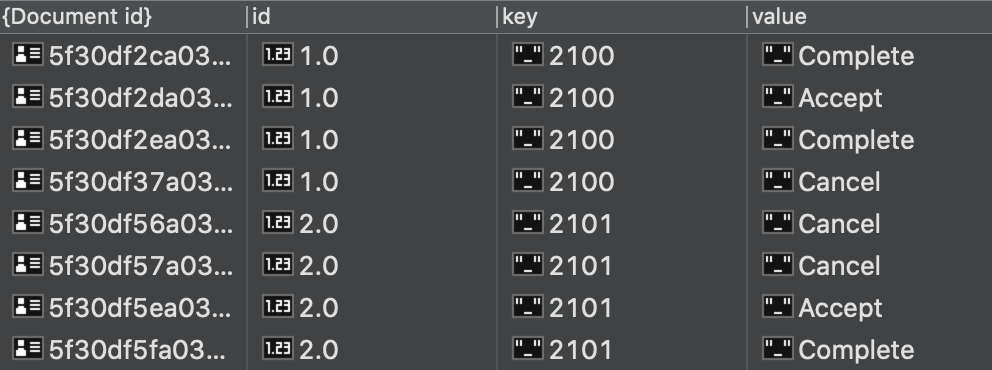 }因此,只要找到Accept/Complete,它就会增加计数的值/和,并根据已批准的名称存储。对于“取消”,则将值更改为“拒绝”。