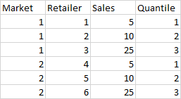 我有市场,零售商和销售部的数据。我需要把每个市场内的零售商放入5分位数。