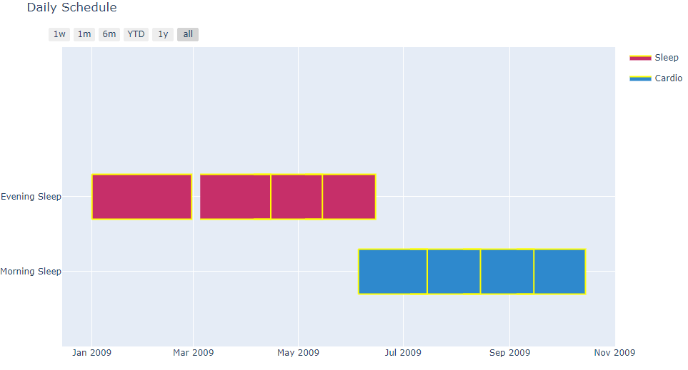 dict(Task=‘Morning Sleep’, Start=‘2009-07-05’, Finish=‘2009-08-15’, Resource=‘Cardio’, Description = ‘my hover1’),