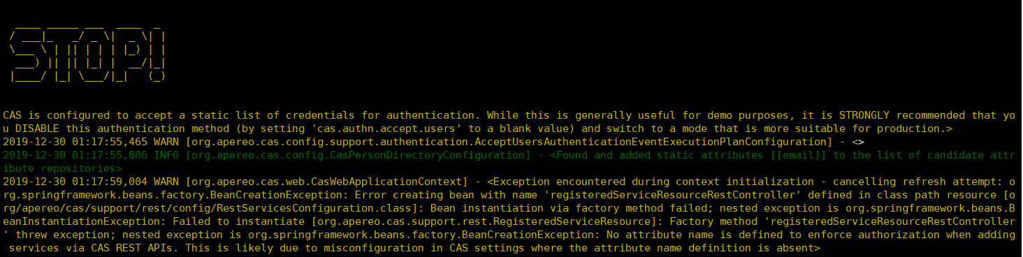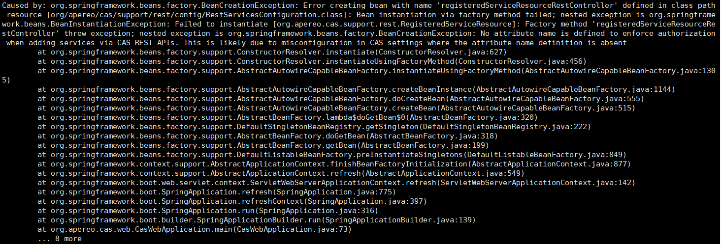 2019-12-30 01:17:59,004 WARN [org.apereo.cas.web.CasWebApplicationContext] - <Exception encountered during context initialization - cancelling refresh attempt: org.springframework.beans.factory.BeanCreationException: Error creating bean with name 'registeredServiceResourceRestController' defined in class path resource [org/apereo/cas/support/rest/config/RestServicesConfiguration.class]: Bean instantiation via factory method failed; nested exception is org.springframework.beans.BeanInstantiationException: Failed to instantiate [org.apereo.cas.support.rest.RegisteredServiceResource]: Factory method 'registeredServiceResourceRestController' threw exception; nested exception is org.springframework.beans.factory.BeanCreationException: No attribute name is defined to enforce authorization when adding services via CAS REST APIs. This is likely due to misconfiguration in CAS settings where the attribute name definition is absent>