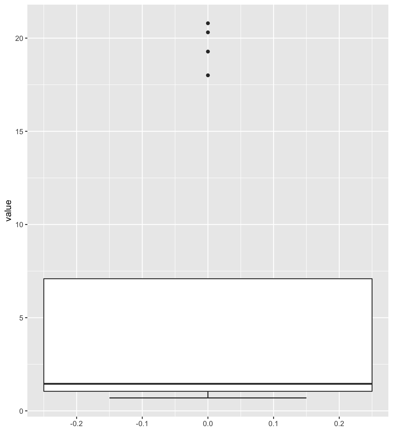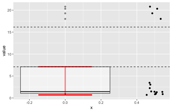 根据geom_boxplot的解释:上晶须从铰链延伸到最大值不超过1.5 * IQR (其中IQR是四分位数范围,或第一和第三四分位数之间的距离)。较低的晶须从铰链延伸到铰链最多1.5 * IQR的最小值。