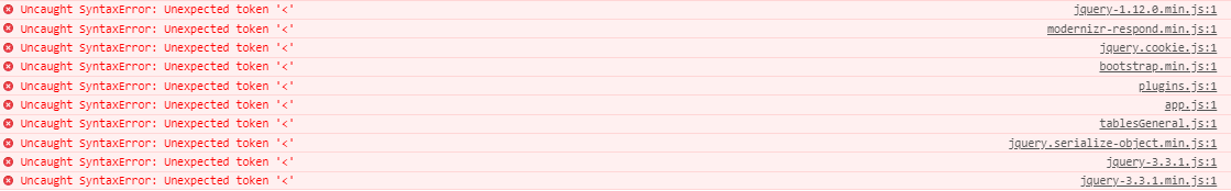 ,如果服务器找不到所请求的js文件,它将服务于html文件的内容,浏览器将尝试将其解析为JavaScript。由于html文件第一行上的第一个字符是<,您将得到一个语法错误,因为这是无效的JavaScript。