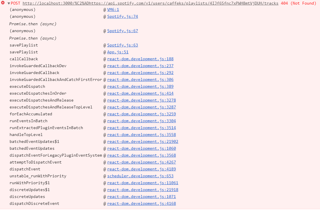 我将其浓缩为独立代码(从React App.js中删除),以便savePlaylist()函数模拟按钮单击(我成功地再现了问题)。下面的Spotify对象保存了获取访问令牌、搜索歌曲和(我感兴趣的内容)创建播放列表,然后保存各自曲目的方法。