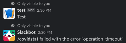 我配置了一个/command,它简单地询问一些有关应请求获取的关于covid感染的数据,答案很好,但是在某些秒(3000 ms的超时)之后,我有一条错误消息“operation_timeout失败了”。