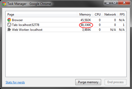 似乎每次我点击F5时,工作进程都被终止并重新启动。这是我所期望的,因为这个工作人员实际上不会被多个“文档”共享。但是,我不明白为什么每次刷新时内存使用量都会增加。