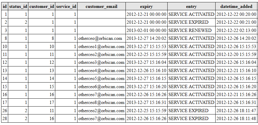 如果您查看表的底部,您将注意到已有客户的条目“服务过期”(customer_id 11和16)有两条记录。