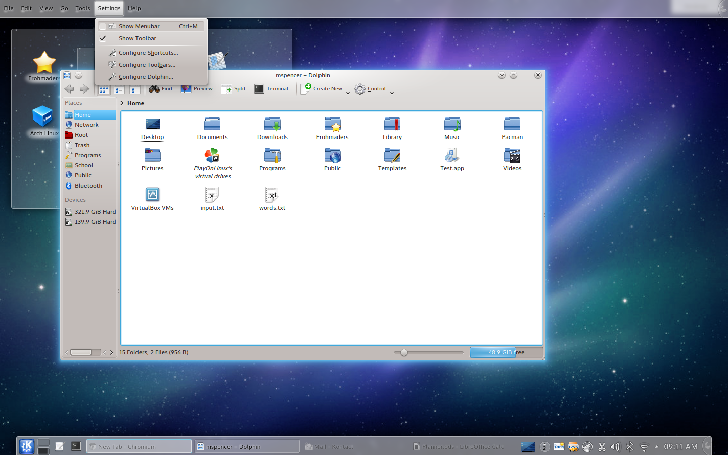 我注意到KDE文件管理器Dolphin就是这样工作的。默认情况下,有一个“控制”按钮,它的菜单集有限。但是,如果存在全局菜单栏,则会导出常规菜单栏,即使它仍然设置为不显示菜单栏。