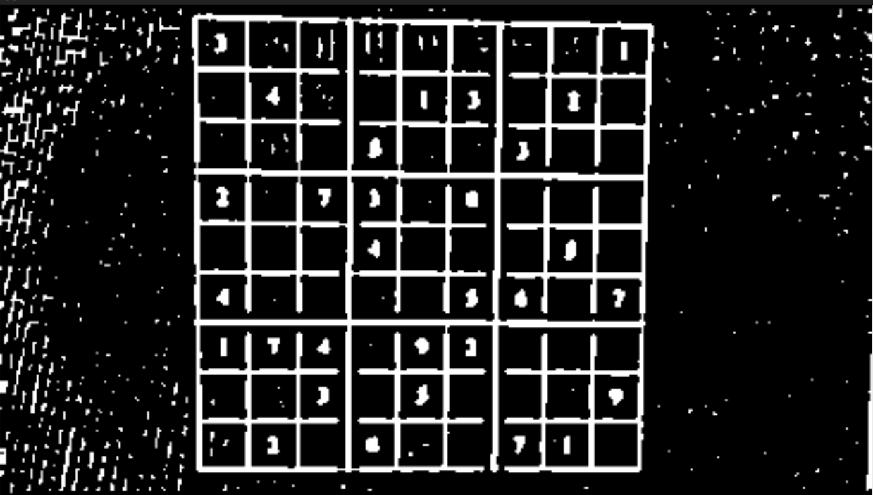 通过手动填充图像中的所有一个像素和两个像素的空白,我能够在自适应阈值处理后重新连接边缘(实际上,为了节省运行时间,我对缩小的图像进行了阈值处理;在上面的全尺寸图像中,空白更大)。下面是我使用的OpenCV代码(为Android绑定编写的)。0是黑色的,-1是白色的。