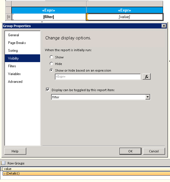 B A 0之后,在文本字段隐藏值上,我使用了表达式=CBool( field!hidden.value)