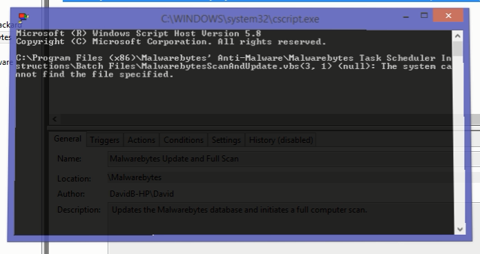 cscript.exe“C:\程序文件(X86)\Malware字节‘反恶意软件\Malware字节任务调度器指令\批Files\MalwarebytesScanAndUpdate.vbs”