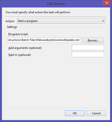 命令行是"C:\Program Files (x86)\Malwarebytes' Anti-Malware\Malwarebytes Task Scheduler Instructions\Batch Files\MalwarebytesScanAndUpdate.vbs"。