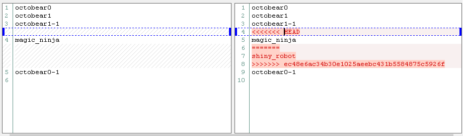 这些是在合并遇到冲突时添加到代码中的注释。这是一种告诉你两段文字冲突的方法。在这种情况下,HEAD和===之间的文本是当前分支中的文本。===和>>>>之间的文本是正在合并的分支中的代码。结尾的长数字只是这里合并的项的SHA1值。您可以通过发出以下命令来完整地查看它