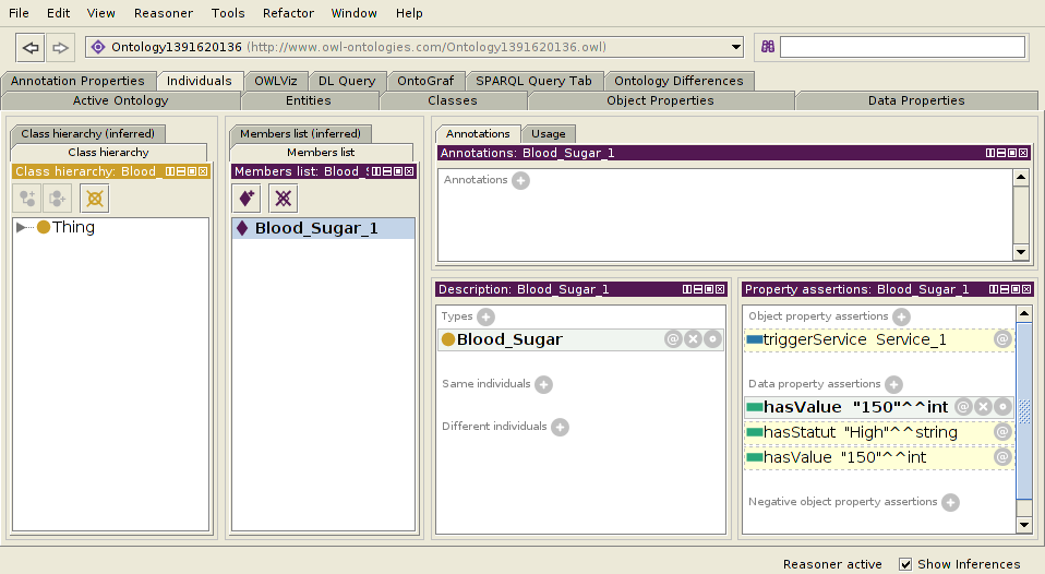 我已经创建了这个本体,它包含两个类:血糖和服务。血糖有两个数据属性: hasValu和range xsd:int,以及hasStatut与range xsd:string。对象属性triggerService以血糖为域,服务为范围.