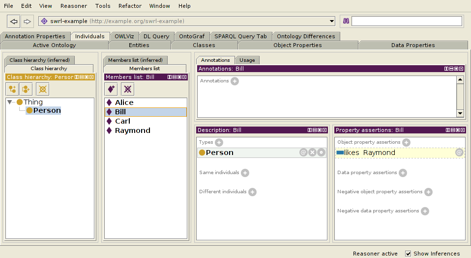 在启用颗粒推理器(Reasoner > Pellet,然后reasoner > Start Reasoner)之后,我们得到了预期的结果。比尔喜欢雷蒙德:
